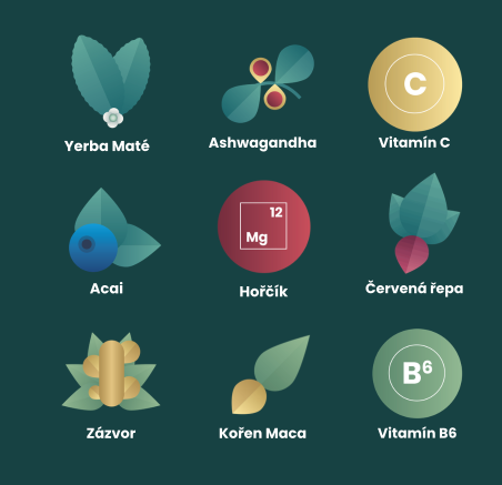 Používáme přírodní výtažky z yerba maté a bylin, které dávají energii bez nervozity, vitamíny a minerály pro každodenní pohodu a prebiotikum inulin, které podporuje trávení.