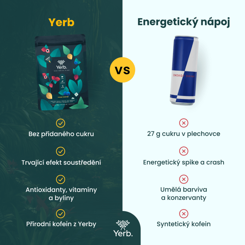 Yerb to dělá jinak. Obsahuje přírodní matein (forma kofeinu) z yerba maté, který se vstřebává pomaleji a působí déle. Je doplněný o L-theanin ze zeleného čaje, který pomáhá zklidnit mysl a udržet pozornost bez přepětí.
