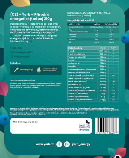Yerb obsahuje přírodní kofein z Yerba Maté, kterému se říká matein. Působí na tělo a mysl mnohem plynuleji a nezpůsobuje energetické výkyvy.